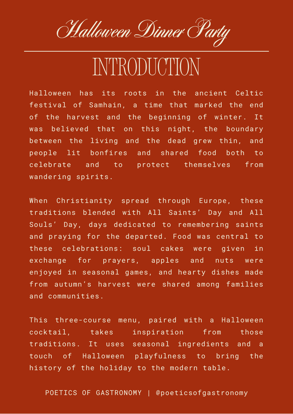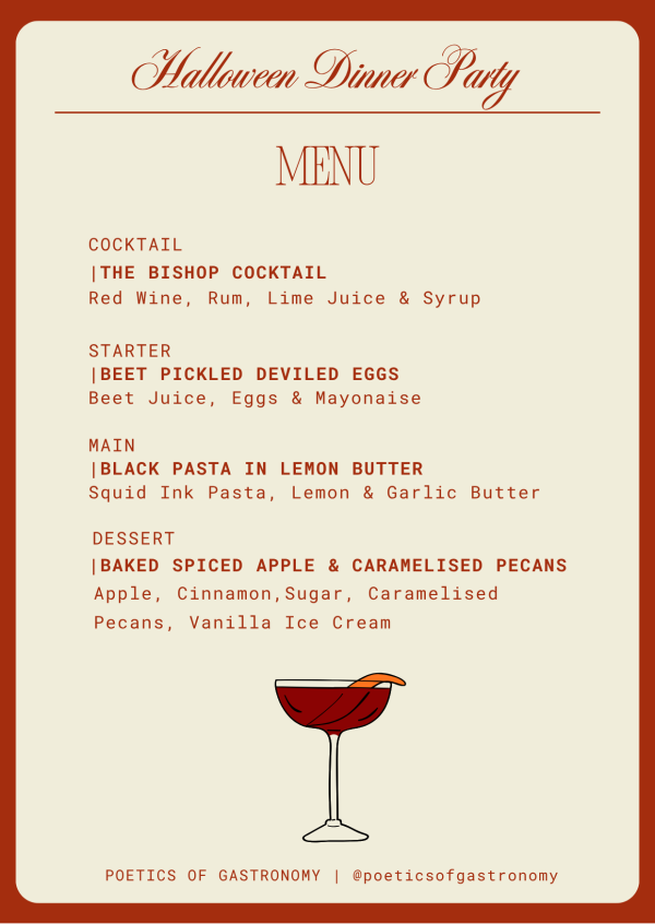 This three-course menu, paired with a Halloween cocktail, takes inspiration from those traditions. It uses seasonal ingredients and a touch of Halloween playfulness to bring the history of the holiday to the modern table.